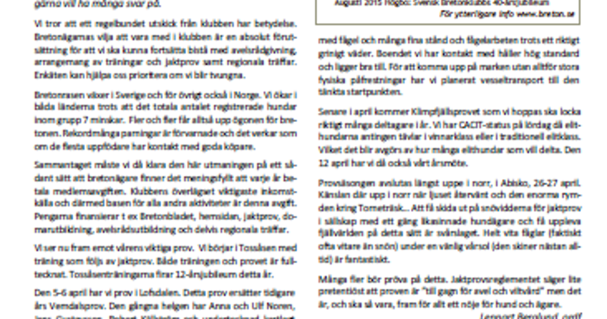 BretonBladet 2014-1 Öppna BretonBladet 2014-1 som PDF Andra nummer av BretonBladet BretonBladet 2025-2/3 Omslagsbild: Almkullens HrimaFoto: Johanna Olofsson BretonBladet 2025-1 Omslagsbild: Fiskonfjällets Tua och Graipesvares DivaFoto: Johanna Olofsson BretonBladet 2024-4 Omslagsbild: Vinnare av Breton-SM 2024 och domareFoto: Anna Norén BretonBladet 2024-3 Omslagsbild: En glad Åge Lekanger, med en numera meriterad unghund Ruffedalen´s TP Siri, vandrar nedför fjälletFoto: Paul Lundblad BretonBladet 2024-2 Omslagsbild: Tors RivaFoto: Johanna Olofsson BretonBladet 2024-1 Omslagsbild: 4 av 5 valpar från Crilos K-kullFoto: Cristher Sandström BretonBladet 2023-3/4 Omslagsbild: Vakkuniva-Tarzans T/S Tara, Ägare: Joachim AlmgrenFoto: Fredrik Almespång BretonBladet 2023-2 Omslagsbild: Snöfjällets Chili, Ägare: Björn ThunellFoto: Mats Ryderheim BretonBladet 2023-1 Omslagsbild: Graipesvares FrostÄgare: Pernilla Bonde BretonBladet 2022-4 Omslagsbild: Överst: Årets hund - Lill-Gemons Liva Under vänster: Årets unghund – Lill-Gemons Nemo Under höger: Årets unghund & Årets Allroundhund - Lill-Gemons Nebbiolo. BretonBladet 2022-3 Omslagsbild: Stefan Hörnlund med Fikonfjällets Zita BretonBladet 2022-2 Omslagsbild: Nicklas Voutilainen och DexterFoto: Stig-Åke ”Pigge” Göransson BretonBladet 2022-1 Omslagsbild: Almkullens KassieFoto: Johanna Olofsson BretonBladet 2021-4 Omslagsbild: Norskt derby Runda 1 med Anders Burvall och ElsaFoto: Rune Frankmoen, Bilden från Fuglehunden, Norskt Derby 2021, dreiebok BretonBladet 2021-3 Omslagsbild: Älvkarlebyutställningen. Domare Anne Eissing med BIR – Snöfjällets Cola (Floyd), ägare Roger Westling och BIM - Eirams Jaffa Jer Järnet, ägare Marie NylanderFoto: Eva Olausson BretonBladet 2021-2 Omslagsbild: Eirams Cajsa Cavat, ägare Jacob Linton, Genarp. Cajsa, dryga året, på väg in med apporten.Foto: Mats Ryderheim BretonBladet 2021-1 Omslagsbild: Almkullens HexaFoto: Johanna Olofsson BretonBladet 2020-4 Omslagsbild: Överst: Årets hund - Lill-Gemons Luna. Under vänster: Årets allround hund - Crilos H Annie.Under höger: Årets unghund - Spakken-Shaz. BretonBladet 2020-3 Omslagsbild: Fiskonfjällets Grim med matte Veronica Vågstedt WärmeFoto: Sangita Jonsson BretonBladet 2020-2 Omslagsbild: Pålamannens ElvaFoto: Johanna Olofsson BretonBladet 2020-1 Omslagsbild: Årets Unghund - Lillgemons LivaFoto: Ulf Graipe BretonBladet 2019-4 Omslagsbild: Bretonklubben på väg mot TossåsenFoto: Birgitta Rådman BretonBladet 2019-3 Omslagsbild: Fikarast vid Korsvattnet - Fågelpremiären 2019Foto: Birgitta Rådman BretonBladet 2019-2 Omslagsbild: Strandbys Felix. Ägare: Maine SternerFoto: Johanna Olofsson BretonBladet 2019-1 Omslagsbild: Smegattus hundarFoto: Bibi Staaf BretonBladet 2018-4 Omslagsbild: Rickardssons SkareFoto: Marianne Lindgren BretonBladet 2018-3 Omslagsbild: Lill-Gemons Mac-Nevis BretonBladet 2018-2 Omslagsbild: Jerpsetras C NoraFoto: Anders Burwall BretonBladet 2018-1 Omslagsbild: Från Tossåsen BretonBladet 2017-4 Omslagsbild: Anders Ylén och Almkullens Freja reser en fasanFoto: Johanna Olofsson BretonBladet 2017-3 Omslagsbild: Bästa ekipage - Anders Hennerfors och Synnermoen´s Jack BretonBladet 2017-2 Foto: Johanna Olofsson BretonBladet 2017-1 Foto: EA Photograpy BretonBladet 2016-4 BretonBladet 2016-3 Foto: Johanna Olofsson BretonBladet 2016-2 BretonBladet 2016-1 BretonBladet 2015-4 BretonBladet 2015-3 BretonBladet 2015-2 BretonBladet 2015-1 BretonBladet 2014-4 BretonBladet 2014-3 BretonBladet 2014-2 BretonBladet 2013-4 Omslagsbild: Troy, 2 månaderFoto: Kjell Lundberg BretonBladet 2013-3 Omslagsbild: Soligt i Jämtland denna sommarFoto: Magnus Löfgren