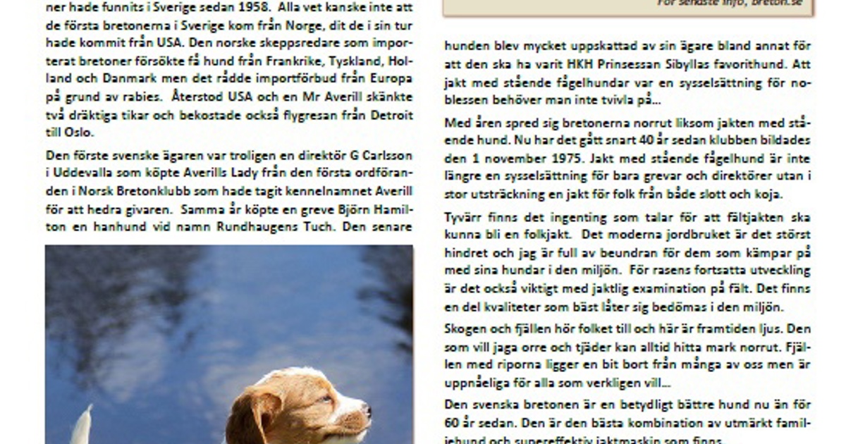 BretonBladet 2015-2 Öppna BretonBladet 2015-2 som PDF Andra nummer av BretonBladet BretonBladet 2025-2/3 Omslagsbild: Almkullens HrimaFoto: Johanna Olofsson BretonBladet 2025-1 Omslagsbild: Fiskonfjällets Tua och Graipesvares DivaFoto: Johanna Olofsson BretonBladet 2024-4 Omslagsbild: Vinnare av Breton-SM 2024 och domareFoto: Anna Norén BretonBladet 2024-3 Omslagsbild: En glad Åge Lekanger, med en numera meriterad unghund Ruffedalen´s TP Siri, vandrar nedför fjälletFoto: Paul Lundblad BretonBladet 2024-2 Omslagsbild: Tors RivaFoto: Johanna Olofsson BretonBladet 2024-1 Omslagsbild: 4 av 5 valpar från Crilos K-kullFoto: Cristher Sandström BretonBladet 2023-3/4 Omslagsbild: Vakkuniva-Tarzans T/S Tara, Ägare: Joachim AlmgrenFoto: Fredrik Almespång BretonBladet 2023-2 Omslagsbild: Snöfjällets Chili, Ägare: Björn ThunellFoto: Mats Ryderheim BretonBladet 2023-1 Omslagsbild: Graipesvares FrostÄgare: Pernilla Bonde BretonBladet 2022-4 Omslagsbild: Överst: Årets hund - Lill-Gemons Liva Under vänster: Årets unghund – Lill-Gemons Nemo Under höger: Årets unghund & Årets Allroundhund - Lill-Gemons Nebbiolo. BretonBladet 2022-3 Omslagsbild: Stefan Hörnlund med Fikonfjällets Zita BretonBladet 2022-2 Omslagsbild: Nicklas Voutilainen och DexterFoto: Stig-Åke ”Pigge” Göransson BretonBladet 2022-1 Omslagsbild: Almkullens KassieFoto: Johanna Olofsson BretonBladet 2021-4 Omslagsbild: Norskt derby Runda 1 med Anders Burvall och ElsaFoto: Rune Frankmoen, Bilden från Fuglehunden, Norskt Derby 2021, dreiebok BretonBladet 2021-3 Omslagsbild: Älvkarlebyutställningen. Domare Anne Eissing med BIR – Snöfjällets Cola (Floyd), ägare Roger Westling och BIM - Eirams Jaffa Jer Järnet, ägare Marie NylanderFoto: Eva Olausson BretonBladet 2021-2 Omslagsbild: Eirams Cajsa Cavat, ägare Jacob Linton, Genarp. Cajsa, dryga året, på väg in med apporten.Foto: Mats Ryderheim BretonBladet 2021-1 Omslagsbild: Almkullens HexaFoto: Johanna Olofsson BretonBladet 2020-4 Omslagsbild: Överst: Årets hund - Lill-Gemons Luna. Under vänster: Årets allround hund - Crilos H Annie.Under höger: Årets unghund - Spakken-Shaz. BretonBladet 2020-3 Omslagsbild: Fiskonfjällets Grim med matte Veronica Vågstedt WärmeFoto: Sangita Jonsson BretonBladet 2020-2 Omslagsbild: Pålamannens ElvaFoto: Johanna Olofsson BretonBladet 2020-1 Omslagsbild: Årets Unghund - Lillgemons LivaFoto: Ulf Graipe BretonBladet 2019-4 Omslagsbild: Bretonklubben på väg mot TossåsenFoto: Birgitta Rådman BretonBladet 2019-3 Omslagsbild: Fikarast vid Korsvattnet - Fågelpremiären 2019Foto: Birgitta Rådman BretonBladet 2019-2 Omslagsbild: Strandbys Felix. Ägare: Maine SternerFoto: Johanna Olofsson BretonBladet 2019-1 Omslagsbild: Smegattus hundarFoto: Bibi Staaf BretonBladet 2018-4 Omslagsbild: Rickardssons SkareFoto: Marianne Lindgren BretonBladet 2018-3 Omslagsbild: Lill-Gemons Mac-Nevis BretonBladet 2018-2 Omslagsbild: Jerpsetras C NoraFoto: Anders Burwall BretonBladet 2018-1 Omslagsbild: Från Tossåsen BretonBladet 2017-4 Omslagsbild: Anders Ylén och Almkullens Freja reser en fasanFoto: Johanna Olofsson BretonBladet 2017-3 Omslagsbild: Bästa ekipage - Anders Hennerfors och Synnermoen´s Jack BretonBladet 2017-2 Foto: Johanna Olofsson BretonBladet 2017-1 Foto: EA Photograpy BretonBladet 2016-4 BretonBladet 2016-3 Foto: Johanna Olofsson BretonBladet 2016-2 BretonBladet 2016-1 BretonBladet 2015-4 BretonBladet 2015-3 BretonBladet 2015-1
