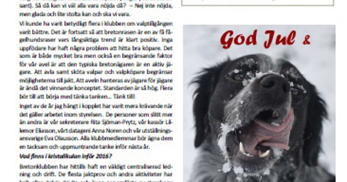 BretonBladet 2015-4 Öppna BretonBladet 2015-4 som PDF Andra nummer av BretonBladet BretonBladet 2025-2/3 Omslagsbild: Almkullens HrimaFoto: Johanna Olofsson BretonBladet 2025-1 Omslagsbild: Fiskonfjällets Tua och Graipesvares DivaFoto: Johanna Olofsson BretonBladet 2024-4 Omslagsbild: Vinnare av Breton-SM 2024 och domareFoto: Anna Norén BretonBladet 2024-3 Omslagsbild: En glad Åge Lekanger, med en numera meriterad unghund Ruffedalen´s TP Siri, vandrar nedför fjälletFoto: Paul Lundblad BretonBladet 2024-2 Omslagsbild: Tors RivaFoto: Johanna Olofsson BretonBladet 2024-1 Omslagsbild: 4 av 5 valpar från Crilos K-kullFoto: Cristher Sandström BretonBladet 2023-3/4 Omslagsbild: Vakkuniva-Tarzans T/S Tara, Ägare: Joachim AlmgrenFoto: Fredrik Almespång BretonBladet 2023-2 Omslagsbild: Snöfjällets Chili, Ägare: Björn ThunellFoto: Mats Ryderheim BretonBladet 2023-1 Omslagsbild: Graipesvares FrostÄgare: Pernilla Bonde BretonBladet 2022-4 Omslagsbild: Överst: Årets hund - Lill-Gemons Liva Under vänster: Årets unghund – Lill-Gemons Nemo Under höger: Årets unghund & Årets Allroundhund - Lill-Gemons Nebbiolo. BretonBladet 2022-3 Omslagsbild: Stefan Hörnlund med Fikonfjällets Zita BretonBladet 2022-2 Omslagsbild: Nicklas Voutilainen och DexterFoto: Stig-Åke ”Pigge” Göransson BretonBladet 2022-1 Omslagsbild: Almkullens KassieFoto: Johanna Olofsson BretonBladet 2021-4 Omslagsbild: Norskt derby Runda 1 med Anders Burvall och ElsaFoto: Rune Frankmoen, Bilden från Fuglehunden, Norskt Derby 2021, dreiebok BretonBladet 2021-3 Omslagsbild: Älvkarlebyutställningen. Domare Anne Eissing med BIR – Snöfjällets Cola (Floyd), ägare Roger Westling och BIM - Eirams Jaffa Jer Järnet, ägare Marie NylanderFoto: Eva Olausson BretonBladet 2021-2 Omslagsbild: Eirams Cajsa Cavat, ägare Jacob Linton, Genarp. Cajsa, dryga året, på väg in med apporten.Foto: Mats Ryderheim BretonBladet 2021-1 Omslagsbild: Almkullens HexaFoto: Johanna Olofsson BretonBladet 2020-4 Omslagsbild: Överst: Årets hund - Lill-Gemons Luna. Under vänster: Årets allround hund - Crilos H Annie.Under höger: Årets unghund - Spakken-Shaz. BretonBladet 2020-3 Omslagsbild: Fiskonfjällets Grim med matte Veronica Vågstedt WärmeFoto: Sangita Jonsson BretonBladet 2020-2 Omslagsbild: Pålamannens ElvaFoto: Johanna Olofsson BretonBladet 2020-1 Omslagsbild: Årets Unghund - Lillgemons LivaFoto: Ulf Graipe BretonBladet 2019-4 Omslagsbild: Bretonklubben på väg mot TossåsenFoto: Birgitta Rådman BretonBladet 2019-3 Omslagsbild: Fikarast vid Korsvattnet - Fågelpremiären 2019Foto: Birgitta Rådman BretonBladet 2019-2 Omslagsbild: Strandbys Felix. Ägare: Maine SternerFoto: Johanna Olofsson BretonBladet 2019-1 Omslagsbild: Smegattus hundarFoto: Bibi Staaf BretonBladet 2018-4 Omslagsbild: Rickardssons SkareFoto: Marianne Lindgren BretonBladet 2018-3 Omslagsbild: Lill-Gemons Mac-Nevis BretonBladet 2018-2 Omslagsbild: Jerpsetras C NoraFoto: Anders Burwall BretonBladet 2018-1 Omslagsbild: Från Tossåsen BretonBladet 2017-4 Omslagsbild: Anders Ylén och Almkullens Freja reser en fasanFoto: Johanna Olofsson BretonBladet 2017-3 Omslagsbild: Bästa ekipage - Anders Hennerfors och Synnermoen´s Jack BretonBladet 2017-2 Foto: Johanna Olofsson BretonBladet 2017-1 Foto: EA Photograpy BretonBladet 2016-4 BretonBladet 2016-3 Foto: Johanna Olofsson BretonBladet 2016-2 BretonBladet 2016-1 BretonBladet 2015-3