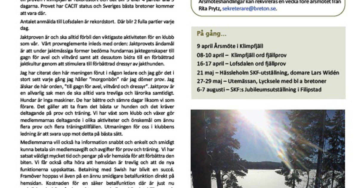 BretonBladet 2016-1 Öppna BretonBladet 2016-1 som PDF Andra nummer av BretonBladet BretonBladet 2025-2/3 Omslagsbild: Almkullens HrimaFoto: Johanna Olofsson BretonBladet 2025-1 Omslagsbild: Fiskonfjällets Tua och Graipesvares DivaFoto: Johanna Olofsson BretonBladet 2024-4 Omslagsbild: Vinnare av Breton-SM 2024 och domareFoto: Anna Norén BretonBladet 2024-3 Omslagsbild: En glad Åge Lekanger, med en numera meriterad unghund Ruffedalen´s TP Siri, vandrar nedför fjälletFoto: Paul Lundblad BretonBladet 2024-2 Omslagsbild: Tors RivaFoto: Johanna Olofsson BretonBladet 2024-1 Omslagsbild: 4 av 5 valpar från Crilos K-kullFoto: Cristher Sandström BretonBladet 2023-3/4 Omslagsbild: Vakkuniva-Tarzans T/S Tara, Ägare: Joachim AlmgrenFoto: Fredrik Almespång BretonBladet 2023-2 Omslagsbild: Snöfjällets Chili, Ägare: Björn ThunellFoto: Mats Ryderheim BretonBladet 2023-1 Omslagsbild: Graipesvares FrostÄgare: Pernilla Bonde BretonBladet 2022-4 Omslagsbild: Överst: Årets hund - Lill-Gemons Liva Under vänster: Årets unghund – Lill-Gemons Nemo Under höger: Årets unghund & Årets Allroundhund - Lill-Gemons Nebbiolo. BretonBladet 2022-3 Omslagsbild: Stefan Hörnlund med Fikonfjällets Zita BretonBladet 2022-2 Omslagsbild: Nicklas Voutilainen och DexterFoto: Stig-Åke ”Pigge” Göransson BretonBladet 2022-1 Omslagsbild: Almkullens KassieFoto: Johanna Olofsson BretonBladet 2021-4 Omslagsbild: Norskt derby Runda 1 med Anders Burvall och ElsaFoto: Rune Frankmoen, Bilden från Fuglehunden, Norskt Derby 2021, dreiebok BretonBladet 2021-3 Omslagsbild: Älvkarlebyutställningen. Domare Anne Eissing med BIR – Snöfjällets Cola (Floyd), ägare Roger Westling och BIM - Eirams Jaffa Jer Järnet, ägare Marie NylanderFoto: Eva Olausson BretonBladet 2021-2 Omslagsbild: Eirams Cajsa Cavat, ägare Jacob Linton, Genarp. Cajsa, dryga året, på väg in med apporten.Foto: Mats Ryderheim BretonBladet 2021-1 Omslagsbild: Almkullens HexaFoto: Johanna Olofsson BretonBladet 2020-4 Omslagsbild: Överst: Årets hund - Lill-Gemons Luna. Under vänster: Årets allround hund - Crilos H Annie.Under höger: Årets unghund - Spakken-Shaz. BretonBladet 2020-3 Omslagsbild: Fiskonfjällets Grim med matte Veronica Vågstedt WärmeFoto: Sangita Jonsson BretonBladet 2020-2 Omslagsbild: Pålamannens ElvaFoto: Johanna Olofsson BretonBladet 2020-1 Omslagsbild: Årets Unghund - Lillgemons LivaFoto: Ulf Graipe BretonBladet 2019-4 Omslagsbild: Bretonklubben på väg mot TossåsenFoto: Birgitta Rådman BretonBladet 2019-3 Omslagsbild: Fikarast vid Korsvattnet - Fågelpremiären 2019Foto: Birgitta Rådman BretonBladet 2019-2 Omslagsbild: Strandbys Felix. Ägare: Maine SternerFoto: Johanna Olofsson BretonBladet 2019-1 Omslagsbild: Smegattus hundarFoto: Bibi Staaf BretonBladet 2018-4 Omslagsbild: Rickardssons SkareFoto: Marianne Lindgren BretonBladet 2018-3 Omslagsbild: Lill-Gemons Mac-Nevis BretonBladet 2018-2 Omslagsbild: Jerpsetras C NoraFoto: Anders Burwall BretonBladet 2018-1 Omslagsbild: Från Tossåsen BretonBladet 2017-4 Omslagsbild: Anders Ylén och Almkullens Freja reser en fasanFoto: Johanna Olofsson BretonBladet 2017-3 Omslagsbild: Bästa ekipage - Anders Hennerfors och Synnermoen´s Jack BretonBladet 2017-2 Foto: Johanna Olofsson BretonBladet 2017-1 Foto: EA Photograpy BretonBladet 2016-4 BretonBladet 2016-3 Foto: Johanna Olofsson BretonBladet 2016-2 BretonBladet 2015-4 BretonBladet 2015-3