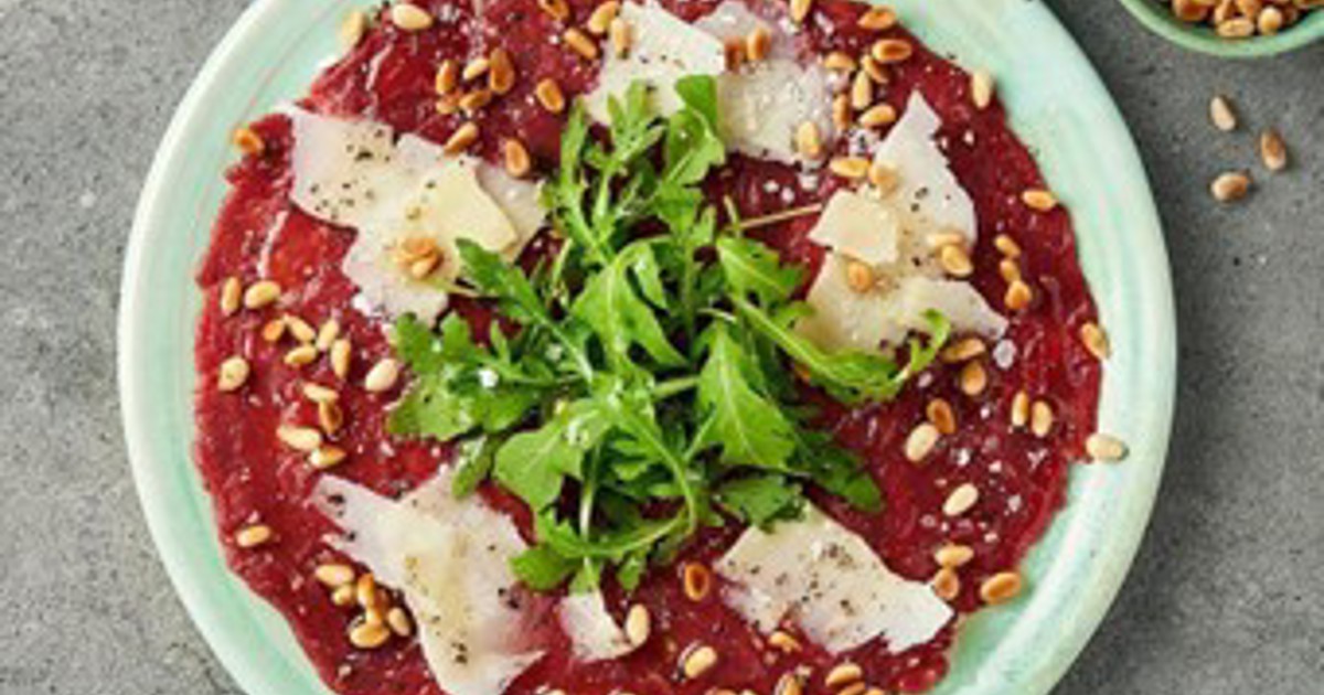 Carpaccio på oxfilé/ripbröst är en lyxig och festlig förrätt. Riktigt gott blir det när de tunna skivorna av oxfilén/ripbröstet serveras med god olivolja, rostade pinjenötter och hyvlad parmesan. På toppen av carpaccion passar rucola och naturligtvis några drag med svartpepparkvarnen.